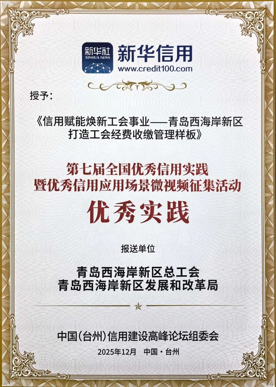开幕式上,由青岛西海岸新区总工会、新区发展和改革局联合报送的《信用赋能焕新工会事业——西海岸新区打造工会经费收缴管理样板》案例,获评“第七届全国信用实践暨优秀信用应用场景微视频征集活动优秀实践”,成为全国工会系统首个将信用管理深度融入工会经费收缴的创新实践,为行业规范化发展提供了可复制的制度样板。