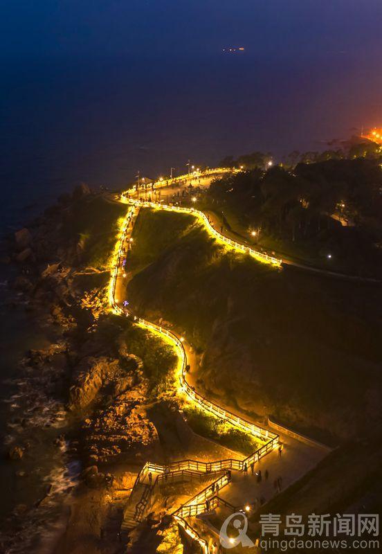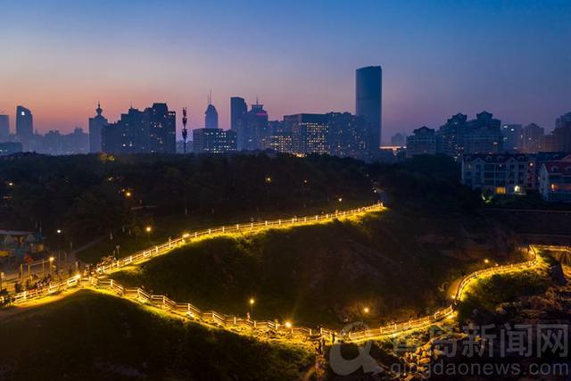到了傍晚,公园的栈道两旁亮起灯光,蜿蜒曲折,又让身处其间的人们感觉到温馨浪漫。很多年轻人纷纷来到这里拍照,并上传各种社交媒体平台,使这里成为目前青岛最受欢迎的网红打卡地之一。