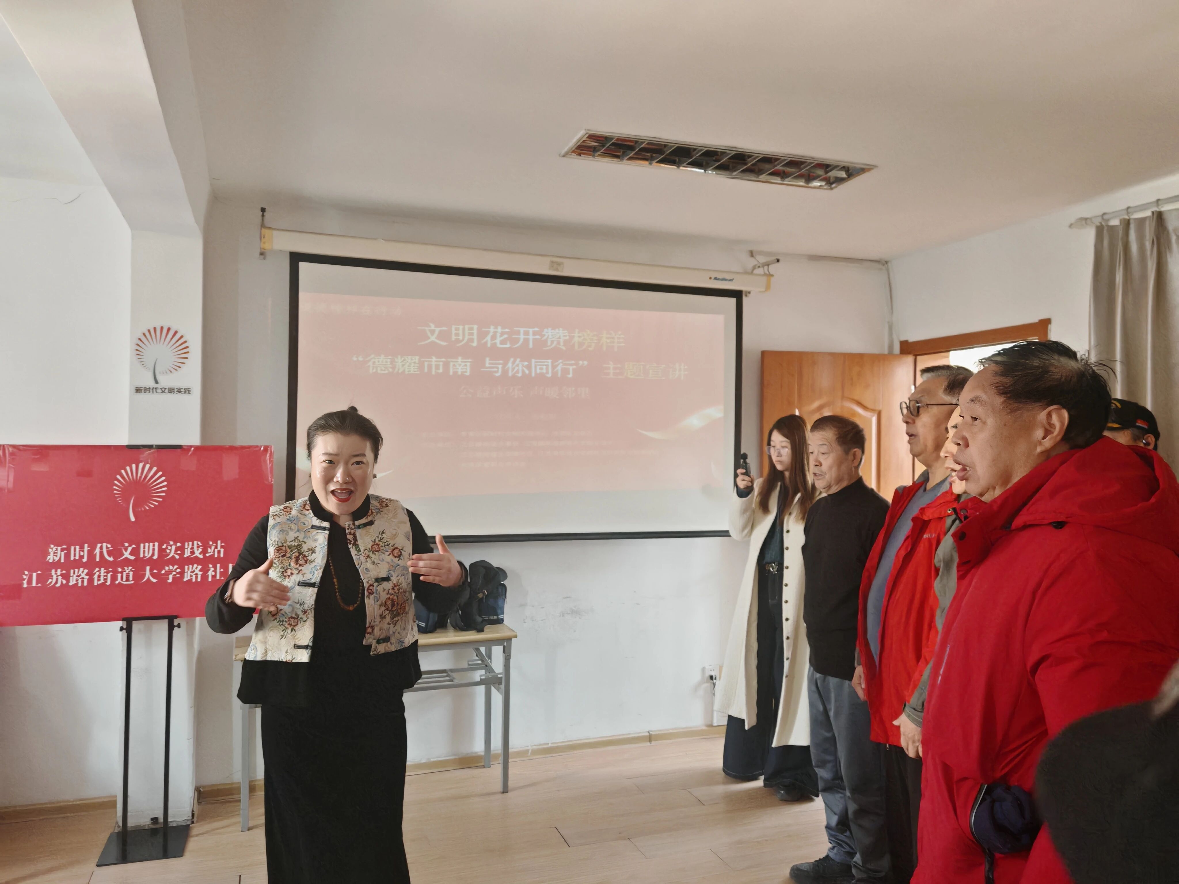 2月3日,市南区在江苏路街道大学路社区新时代文明实践站举办“文明花开赞榜样——德耀市南 与你同行”之“公益声乐 声暖邻里”主题宣讲活动。活动由市南区新时代文明实践中心、市南区文明办主办,江苏路街道办事处、江苏路街道新时代文明实践所、江苏路街道大学路社区、江苏路街道大学路社区新时代文明实践站、青岛市市南区爱帮合声协会承办。