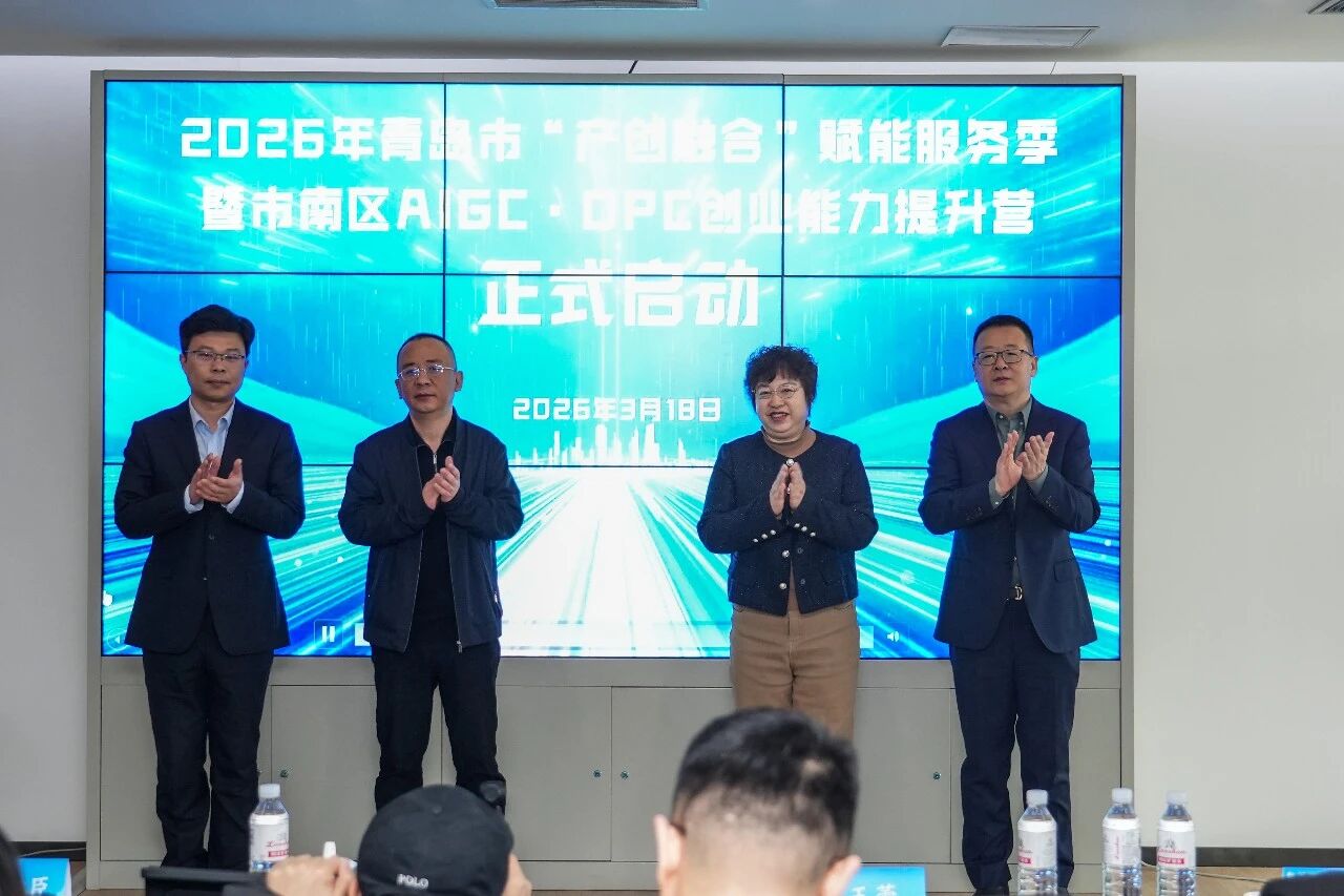 3月18日上午,由青岛市人力资源和社会保障局指导,市南区人力资源和社会保障局、市南区工业和信息化局主办,青岛市广播电视台(集团)、青岛海诺投资发展有限公司、青岛农商银行市南支行、青岛人才发展集团协办的2026年青岛市“产创融合”赋能服务季暨市南区首期AIGC·OPC创业能力提升营,在青岛AIGC·OPC产业基地正式启幕。市、区相关部门领导、创业导师及参训学员等80余人齐聚一堂,共同见证这场聚焦AIGC数字视听细分赛道、助力OPC产业集聚发展的创业赋能盛会。