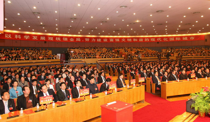 大会号召,全市各级党组织、全体共产党员和广大干部群众要更加紧密地团结在以胡锦涛同志为总书记的党中央周围,高举邓小平理论和“三个代表”重要思想伟大旗帜,全面落实科学发展观,以更加坚定的信心、更加昂扬的斗志、更加扎实的作风,同心同德,务实创新,为建设富强文明和谐的现代化国际城市而努力奋斗!