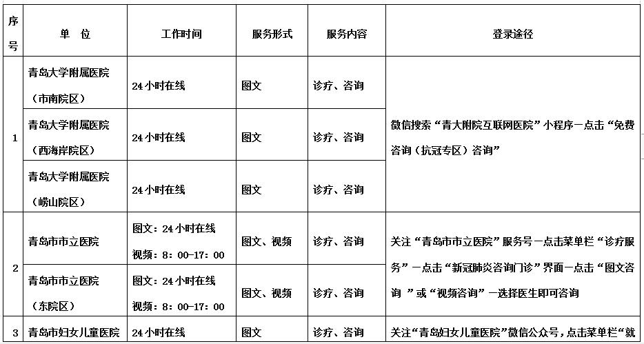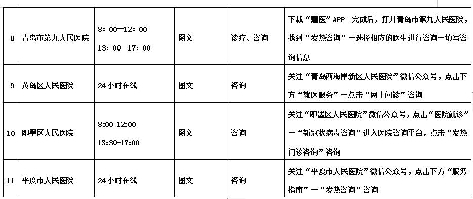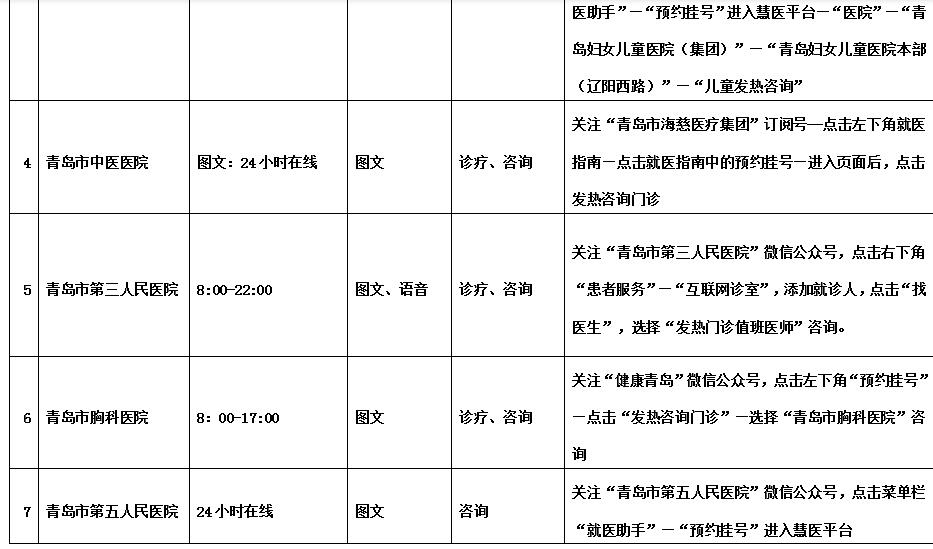 目前,青岛市妇女儿童医院、青岛市口腔医院、青岛市市立医院、青岛市精神卫生中心、青岛市中医医院等11家医院均已开通“网上发热咨询门诊”,通过图文、视频等途径,已向4000余人提供了宣教、咨询和复诊服务。下一步青岛市其他二级以上医院将陆续开通网上发热咨询,同时不断完善相关服务功能,依托“互联网+医疗”,减少医院人群聚集和交叉感染,为市民提供更便捷、安全、周到的服务,共同抗击疫情。