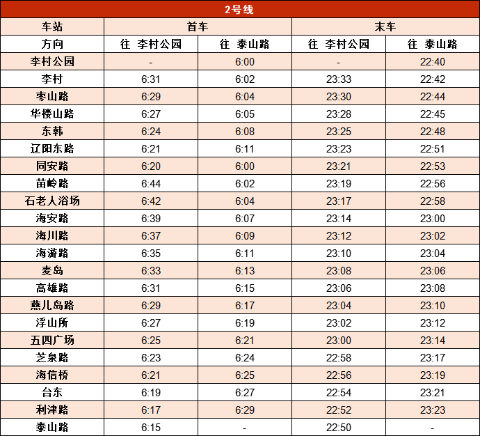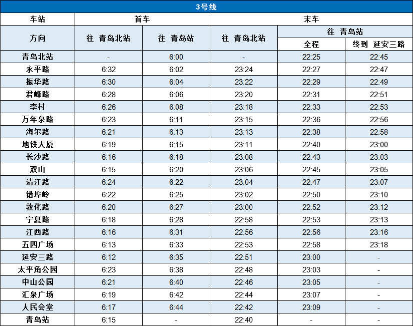 青岛地铁1号线运营时间17.85小时、2号线运营时间17.57小时、3号线运营时间17.43小时、4号线运营时间17.63小时、6号线运营时间16.83小时,8号线运营时间17.45小时,蓝谷快线运营时间17.20小时、西海岸快线运营时间17.23小时(各线路首末班车时刻见下图)。