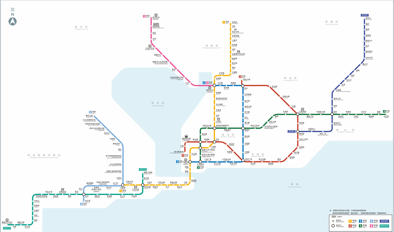 青岛地铁已开通运营线路8条,共设车站172座(换乘站不重复计入),其中青岛地铁1号线(含7号线一期)共设车站41座;青岛地铁2号线一期共设车站25座;青岛地铁3号线共设车站22座;青岛地铁4号线共设车站25座;青岛地铁6号线一期共设运营车站21座;青岛地铁8号线北段共设车站11座;蓝谷快线共设车站21座;西海岸快线共设车站23座(青岛地铁线网图见下图)。