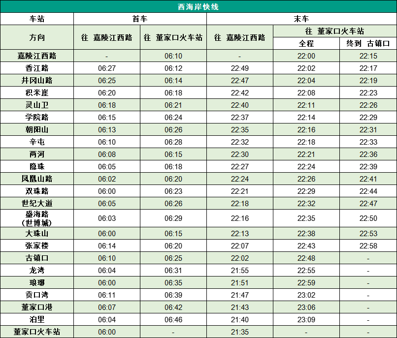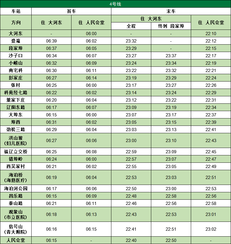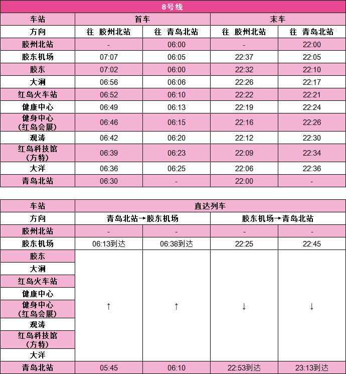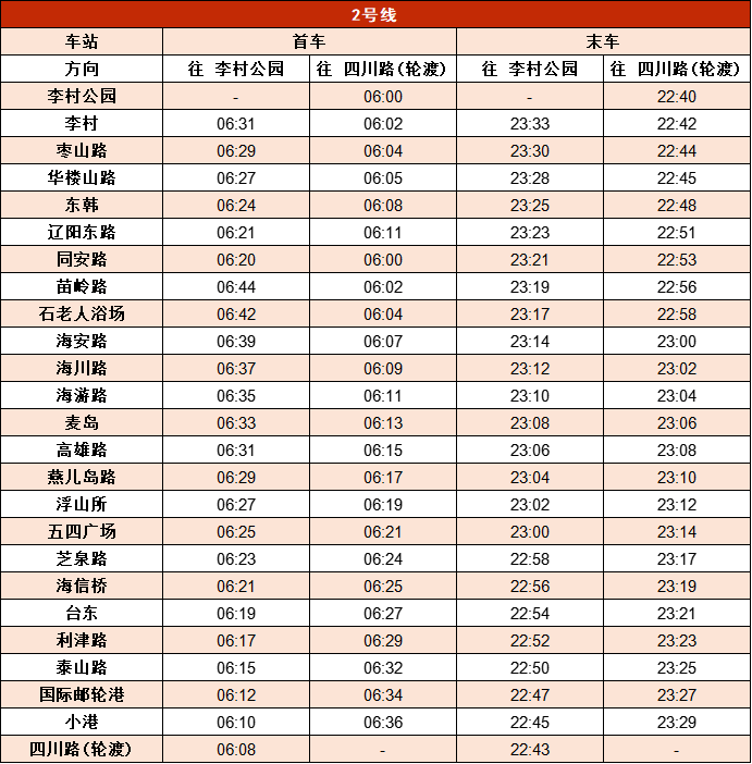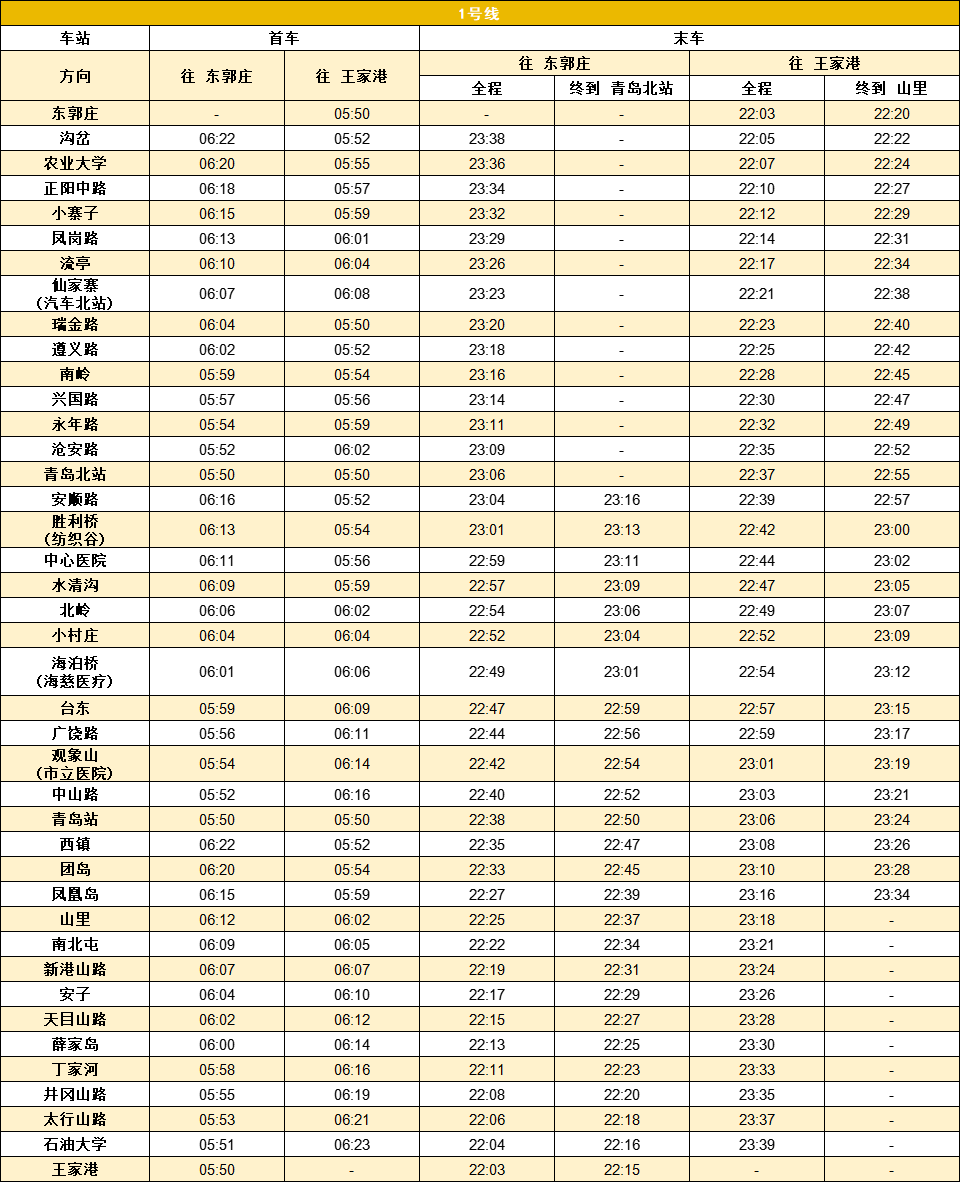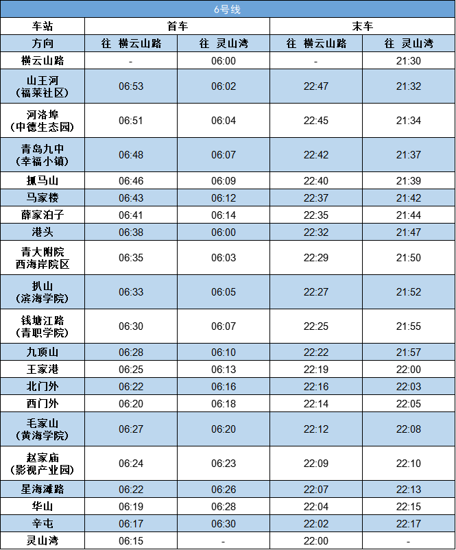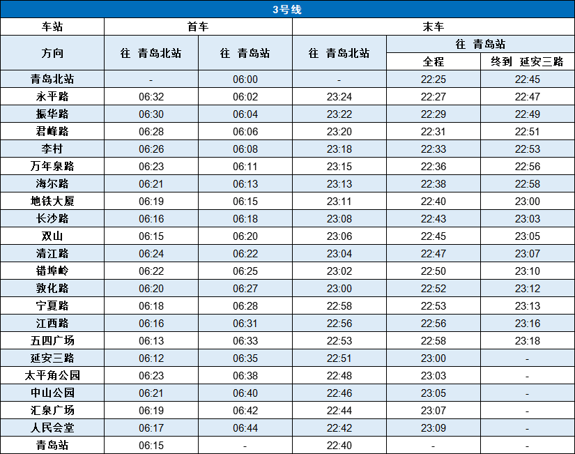 青岛地铁1号线运营时间17小时51分钟、2号线运营时间17小时34分钟、3号线运营时间17小时26分钟、4号线运营时间17小时38分钟、6号线运营时间16小时50分钟、8号线运营时间17小时27分钟,蓝谷快线运营时间17小时12分钟、西海岸快线运营时间17小时14分钟(各线路首末车时刻见下图)。