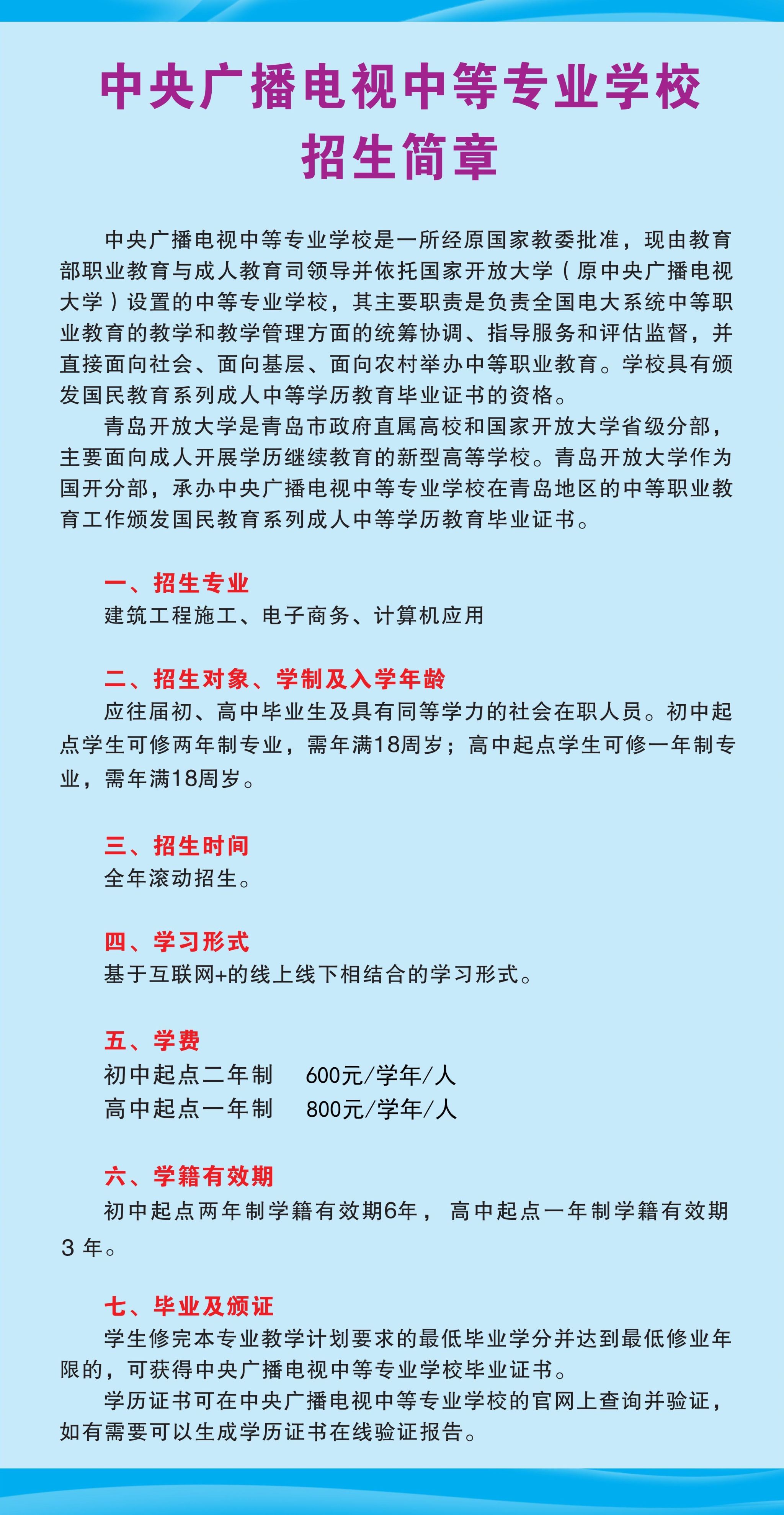 青岛开放大学与中央广播电视中等专业学校合作办学收费标准公示