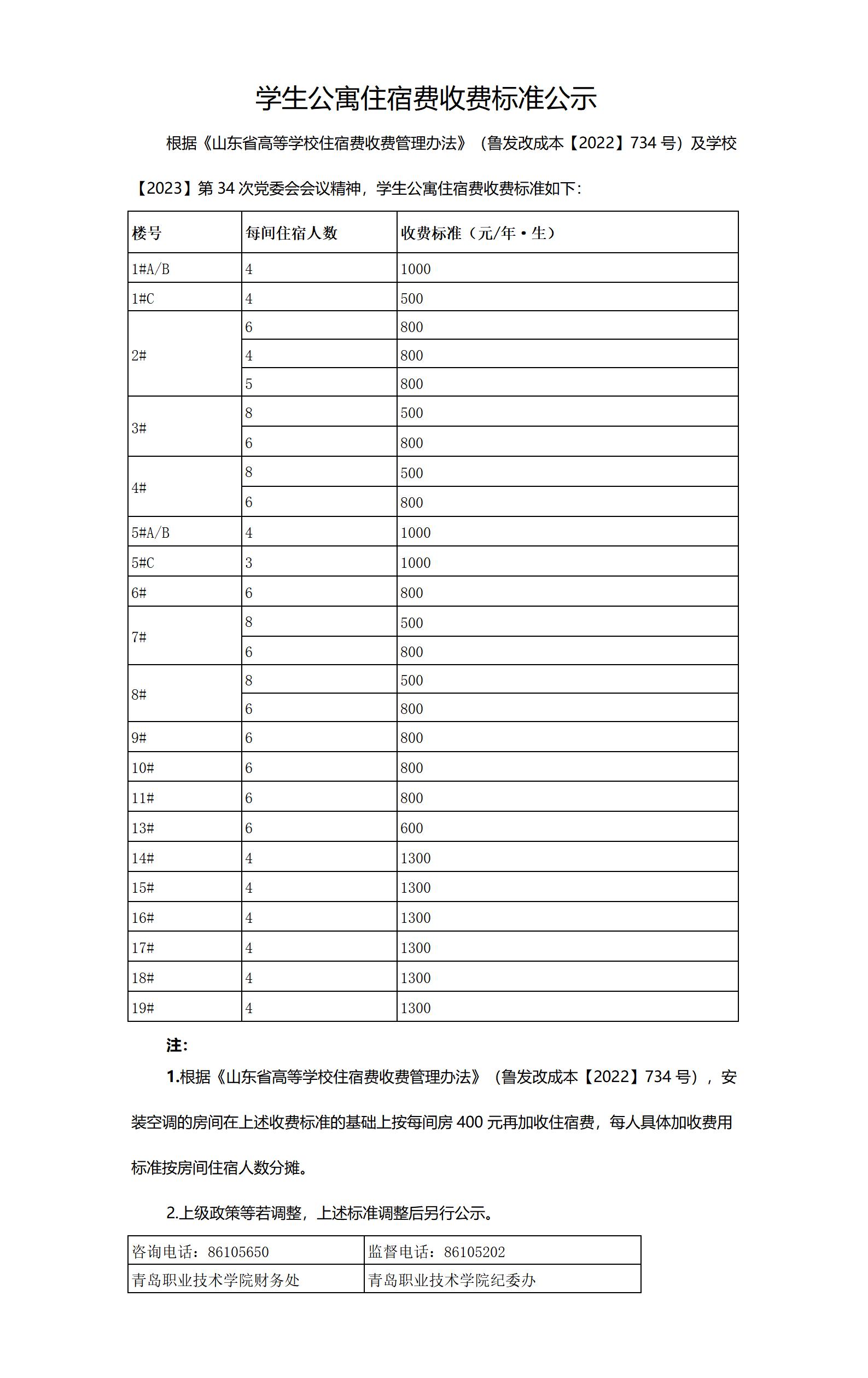 学生公寓住宿费收费标准公示