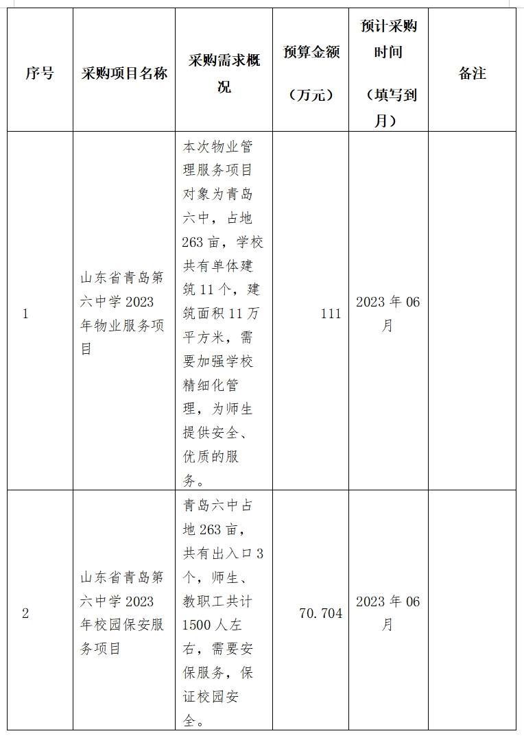 为便于供应商及时了解政府采购信息,根据《财政部关于开展政府采购意向公开工作的通知》(财库〔2020〕10号)等有关规定,现将 山东省青岛第六中学 2023年 06(至)08 月采购意向公开如下: