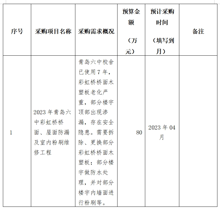 为便于供应商及时了解政府采购信息,根据《财政部关于开展政府采购意向公开工作的通知》(财库〔2020〕10号)等有关规定,现将 山东省青岛第六中学 2023年 04(至)05 月采购意向公开如下: