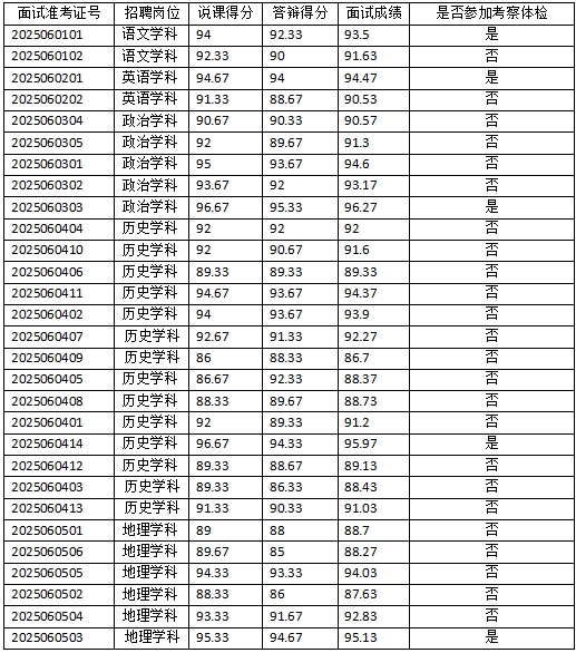 山东省青岛第六中学选聘2025届优秀师范类毕业生面试成绩公告