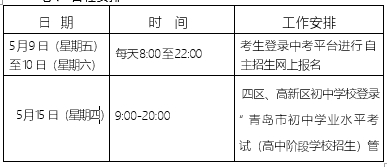 考生于 5 月 9 日(星期五)至 10 日(星期六)每天 8:00 至 22:00 登 录 青 岛 教 育 政 务 网 ( 网 址 : http://edu.qingdao.gov.cn),通过“招生考试”栏目中的“便 民服务系统 ”进入“青岛市初中学业水平考试(高中阶段学校招 生)管理平台 ”,完成自主招生报名。提交成功后,打印报名系 统自动生成的《青岛市2025 年高中学校自主招生报名信息表》。