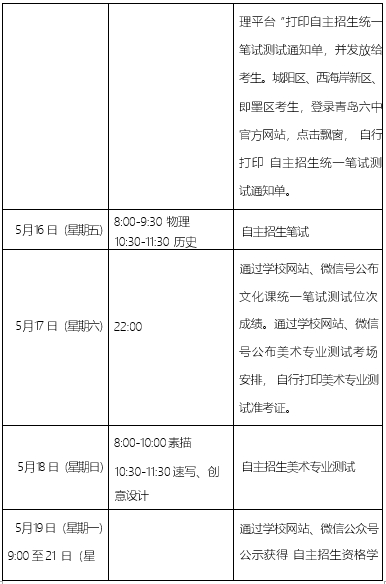 2.城阳区 、西海岸新区 、 即墨区考生于 5 月 15 日 (星期 四)9:00-20:00 期间登录青岛六中官方网站,自行打印 自主招 生统一笔试测试通知单。