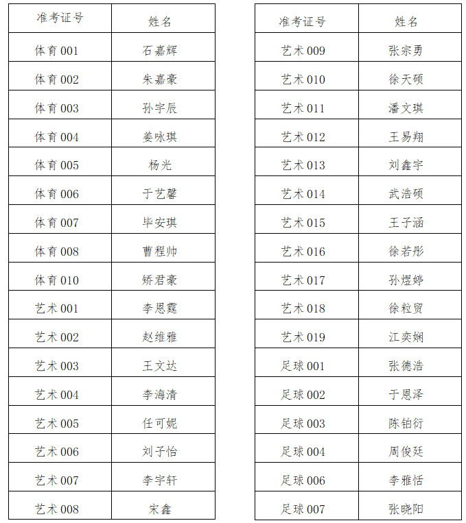 青岛市实验高级中学面向城阳区体育艺术特长生、足球后备人才专业测试合格证发放名单(按准考证号排序)