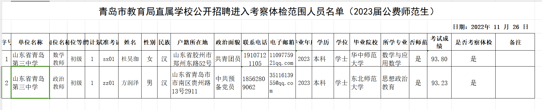 (青岛三中)青岛市教育局直属学校公开招聘进入考察体检范围人员名单((2023届公费师范生))