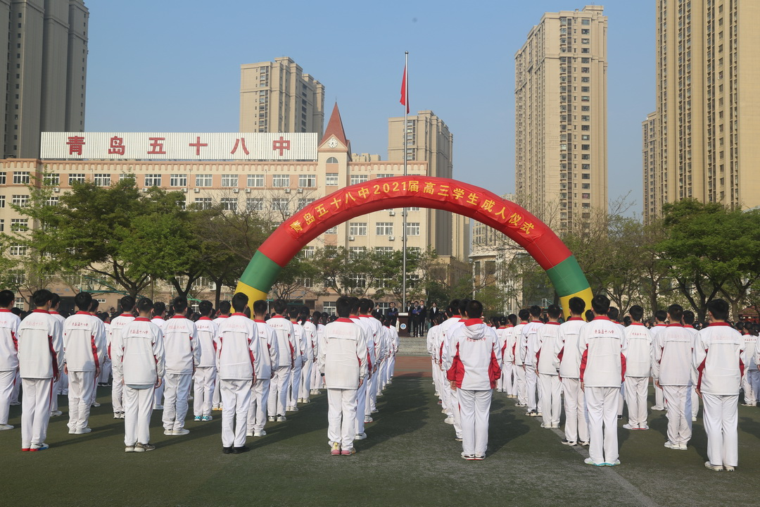 4月26日清晨,青岛五十八中2021届高三学生在操场隆重举行“家国情怀,青年担当”成人仪式。全体师生和高三家长参加了仪式。