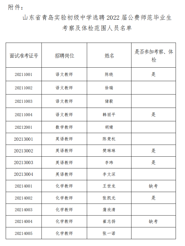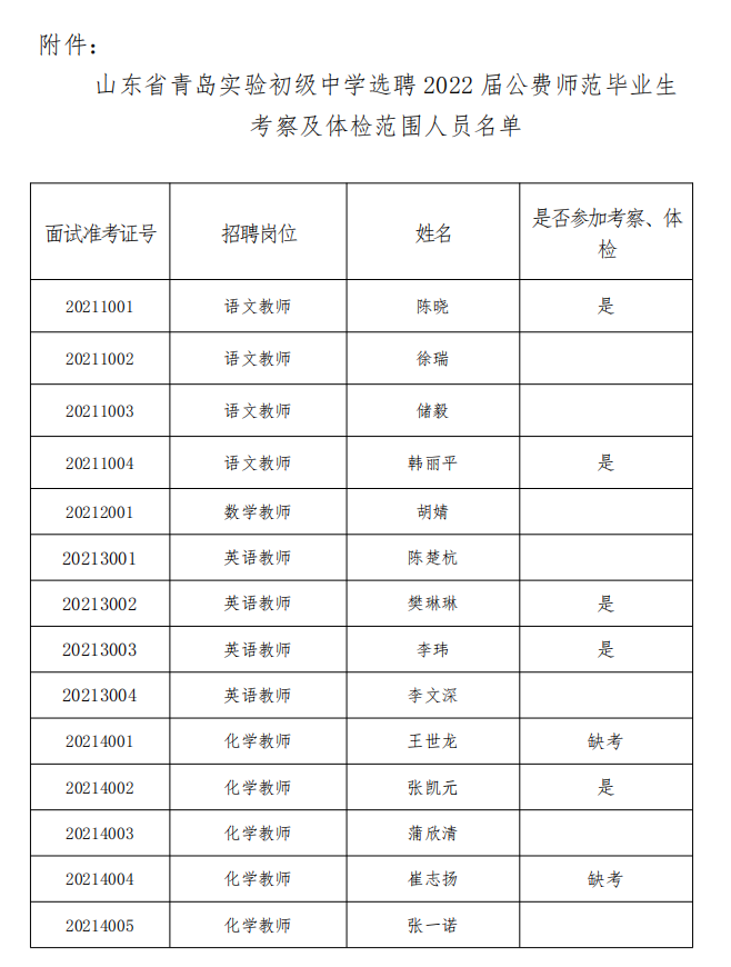 附件:山东省青岛实验初级中学选聘 2022 届公费师范毕业生考察及体检范围人员名单