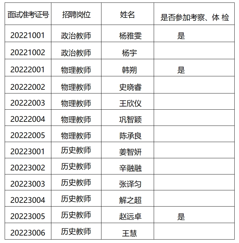 按照《青岛市教育局直属学校选聘 2023 届国家公费师 范毕业生简章》规定,进入考察体检人员名单见附件。进入 考察、体检范围人员中,根据面试成绩和招聘计划, 由高分 到低分等额确定参加考察、体检人员。(附件中“是否参加考察、体检 ”栏标明“是 ”的人员)
