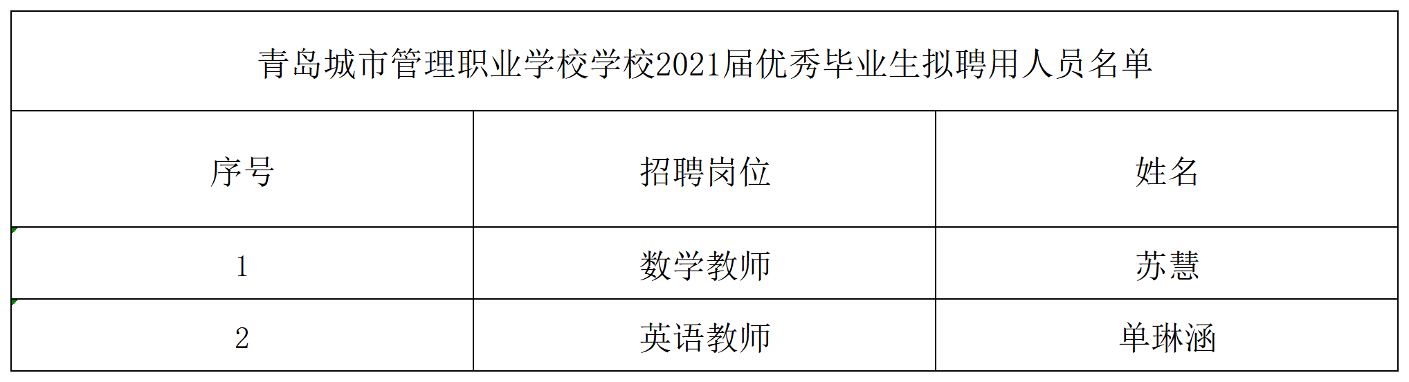 青岛城市管理职业学校选聘2021届优秀毕业生拟聘用人员名单