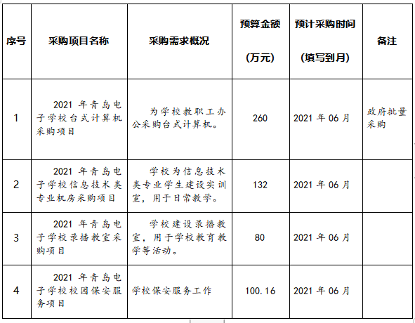 为便于供应商及时了解政府采购信息,根据《财政部关于开展政府采购意向公开工作的通知》(财库〔2020〕10号)等有关规定,现将 青岛电子学校 2021年 05(至)06 月采购意向公开如下: