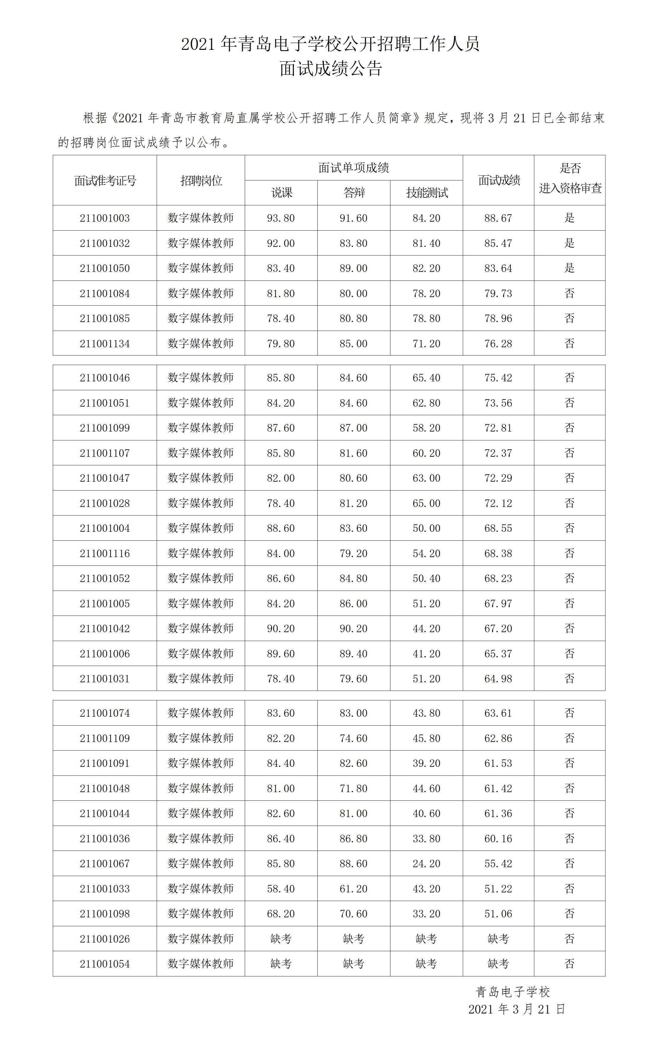 青岛电子学校 2021年公开招聘工作人员面试成绩公告