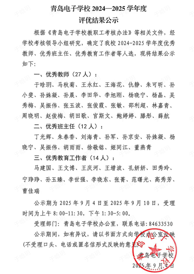 青岛电子学校 2024-2025学年度评优结果公示