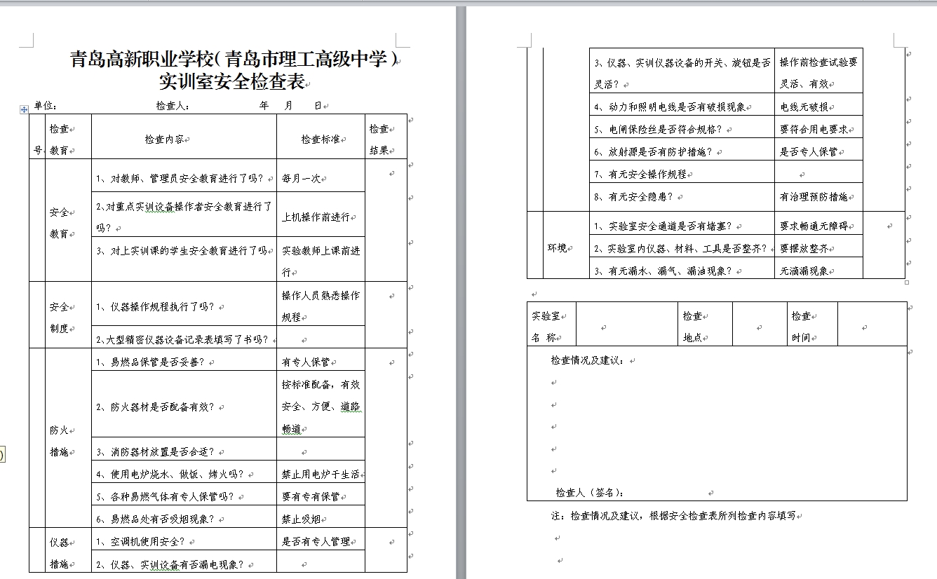 九、要不定期检查各实训基地安全制度执行情况,同时配合学校保卫部门,每学期对实训基地的安全工作进行一次全面检查。
