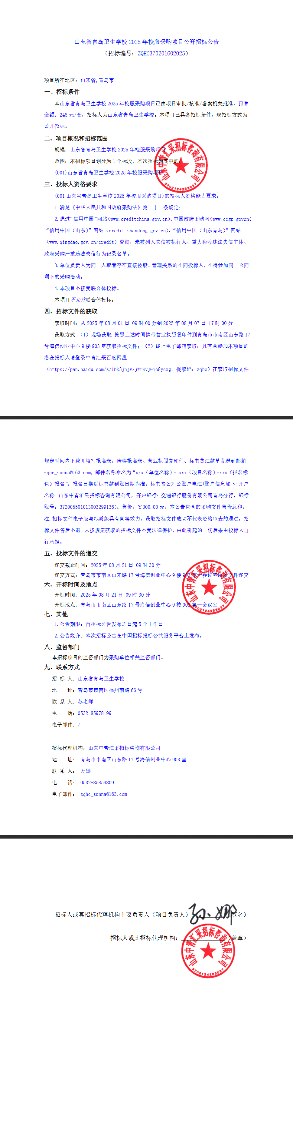 山东省青岛卫生学校2025年校服采购项目公开招标公告