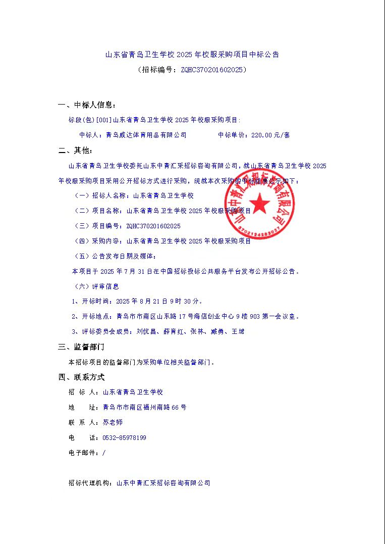 山东省青岛卫生学校2025年校服采购项目中标公告