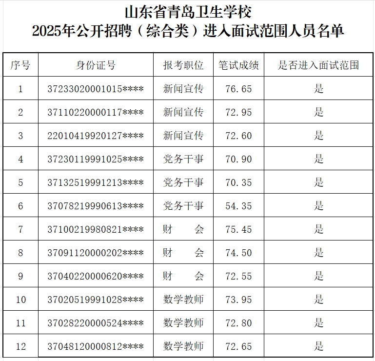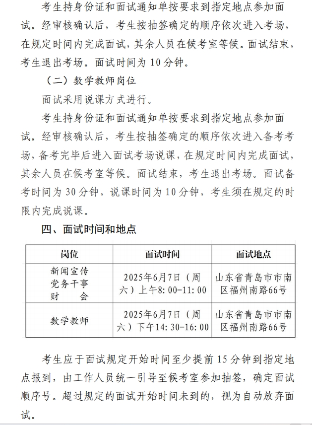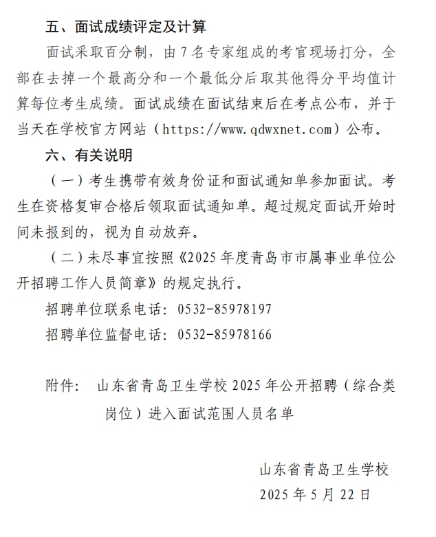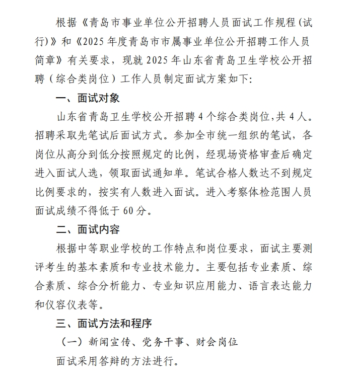 山东省青岛卫生学校2025年公开招聘(综合类岗位)工作人员面试方案