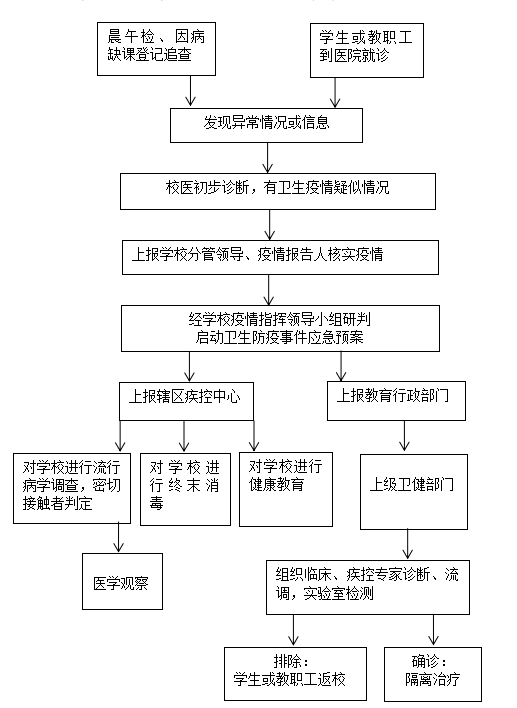 3. 及时上报与结果追踪。建立卫生防疫事件报告管理制度,实行责任制。本着“先控制、后处置、救人第一、减少损失”及“早发现、早报告、早控制、早治疗、早处理”的原则,果断处置,积极处置。学校指定专人作为疫情报告人,负责具体报告工作。建立由学生到教师、到学校疫情报告人、到学校领导的疫情发现、信息登记与报告流程。