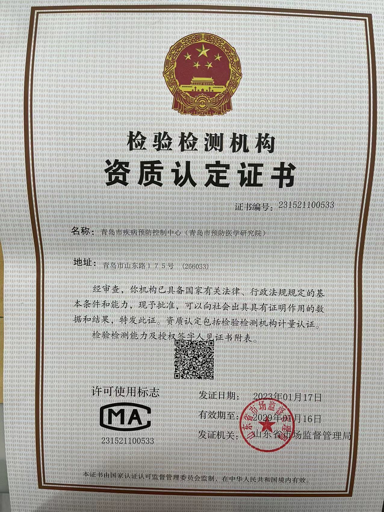 青岛市疾病预防控制中心检验检测机构资质认定证书