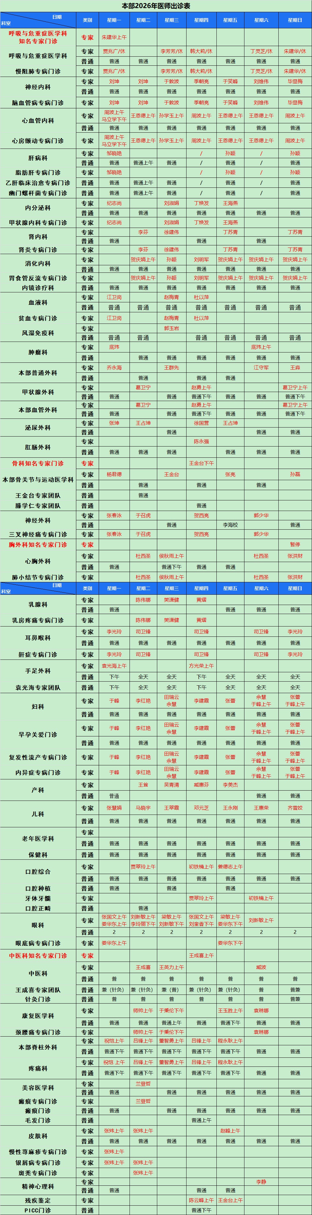 青岛市第八人民医院本部2026年3月份医师出诊表
