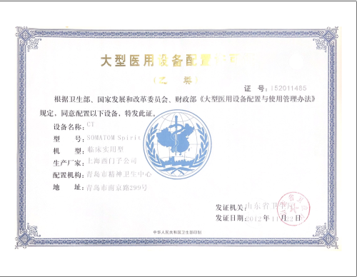 青岛市精神卫生中心大型医用设备配置许可证