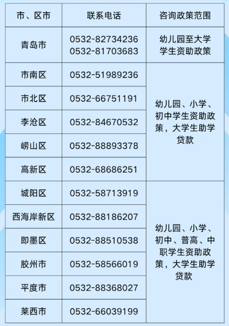 青岛市各级教育行政部门学生资助热线电话
