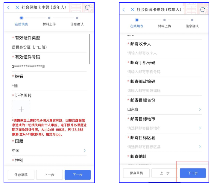 第三步:预检通过后完善个人基本信息,上传证件照片以及填写邮寄地址等相关信息。