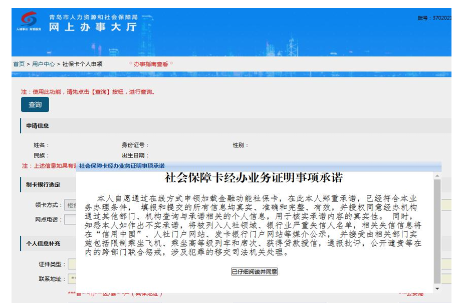 第二步:点击【我已仔细阅读并同意履行承诺】,在社保卡申领页面核实个人【申请信息】。