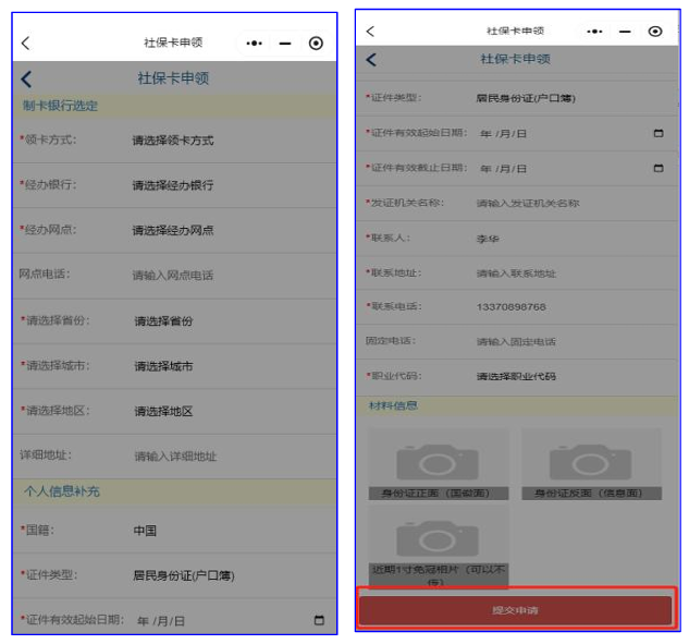 第三步:在“制卡银行选定”栏,选择【领卡方式】【经办银行】,在“个人信息补充”栏补充个人【证件有效起始日期】【证件有效截止日期】【邮寄地址】等详细信息,在“材料信息”栏,上传本人【身份证正面】【身份证反面】【照片】,核实无误后,点击【提交申请】按钮,提交个人社保卡申领申请。