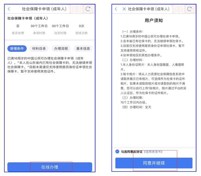 第二步:浏览阅读了解受理条件、材料目录、办理流程等信息,点击“在线办理”,阅读“用户须知”,勾选同意此协议《信用承诺书》,点击【同意并继续】按钮。【授权确认】核实个人基本信息。同意授权并补充【申请人地址】。