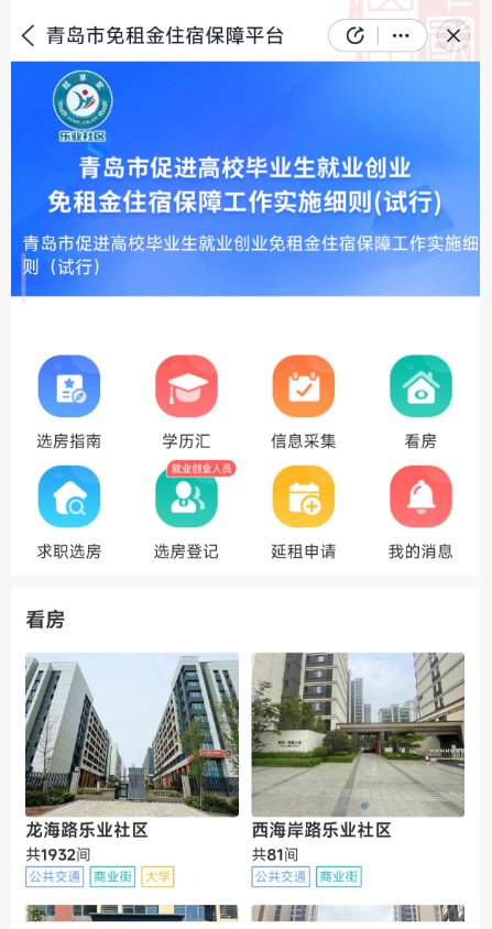 通过“求职选房”及“就业创业选房登记”功能模块,毕业生分别以求职、已在青岛市就业创业身份按如下规定申请选房。