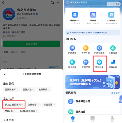方式1:“青岛医疗保障”微信公众号,点击【掌上办 我的医保】→【异地就医】→【新增异地备案办理】。