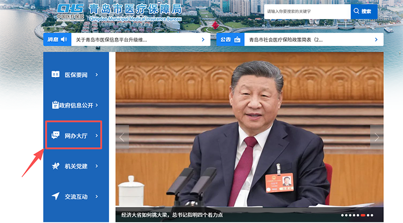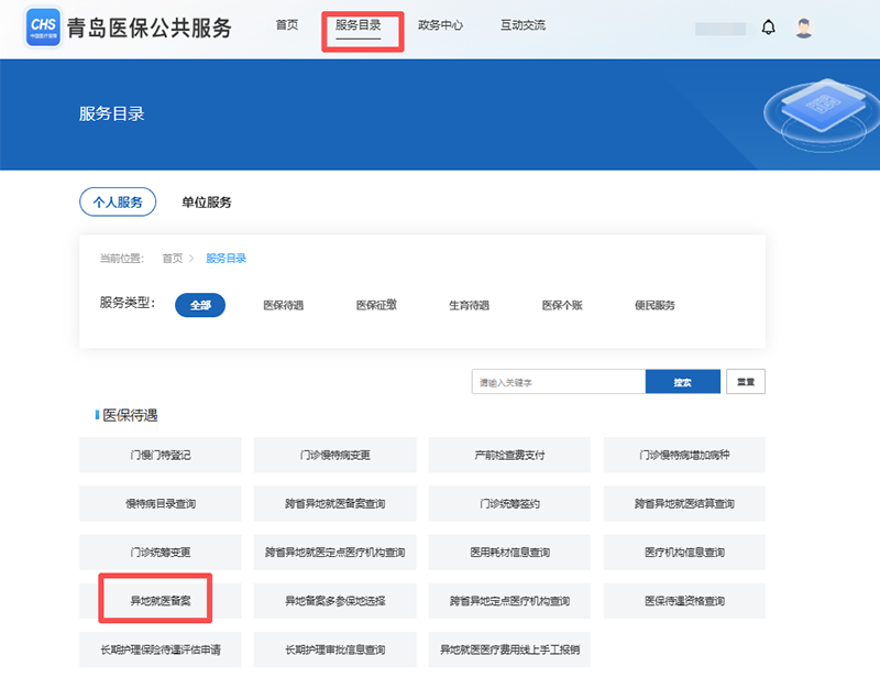 方式2:访问青岛市医疗保障局网站,依次点击【网办大厅】→【服务目录】→【异地就医备案】进行办理。