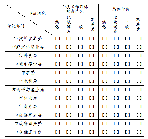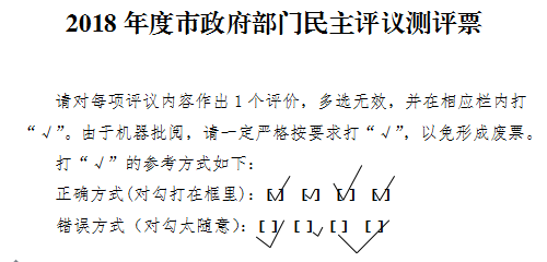 为调查了解市民代表对市政府部门履行职责的满意度,请您结合市政府部门现场述职及平时了解掌握的情况,认真填写《2018年度市政府部门民主评议测评票》。测评结果纳入2018年市政府部门综合考核成绩。