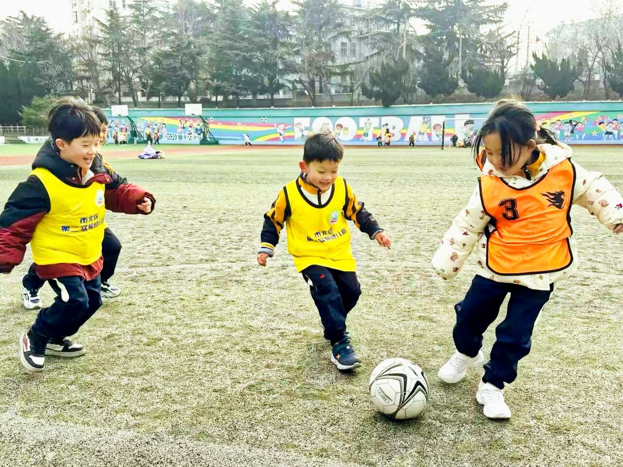 校园开放期间,幼儿园小朋友来到青岛宜阳路小学,孩子们操场上快乐玩耍