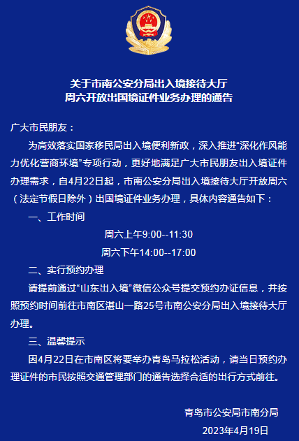 关于市南出入境接待大厅周六开放出国境证件业务办理的通告