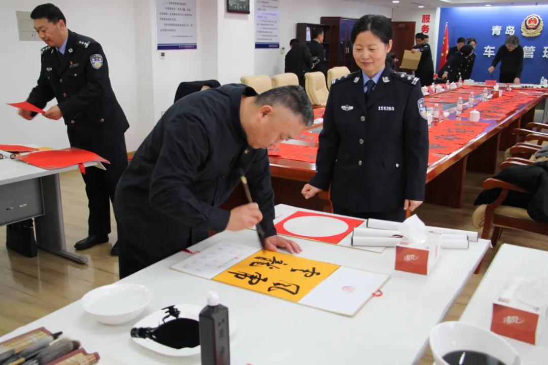 为庆祝第二个“中国人民警察节”,积淀传统文化,传承国学精神,1月10日下午,车管所邀请山东省书法家协会副主席、青岛市书法家协会主席范国强,市书法家协会常务副主席兼秘书长郭强,市书法家协会副主席刘健,以及来自市书法家协会的5名书法家到车管所开展“墨香沁警营 送福进车管”活动。