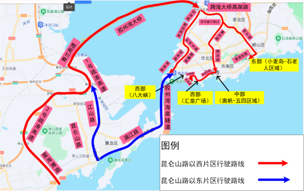 2.昆仑山路以东:可经江山路→1号疏港高速→青兰高速/胶州湾大桥→环湾路/跨海大桥高架路前往市区,或沿胶州湾海底隧道→贵州路驶入西部片区。