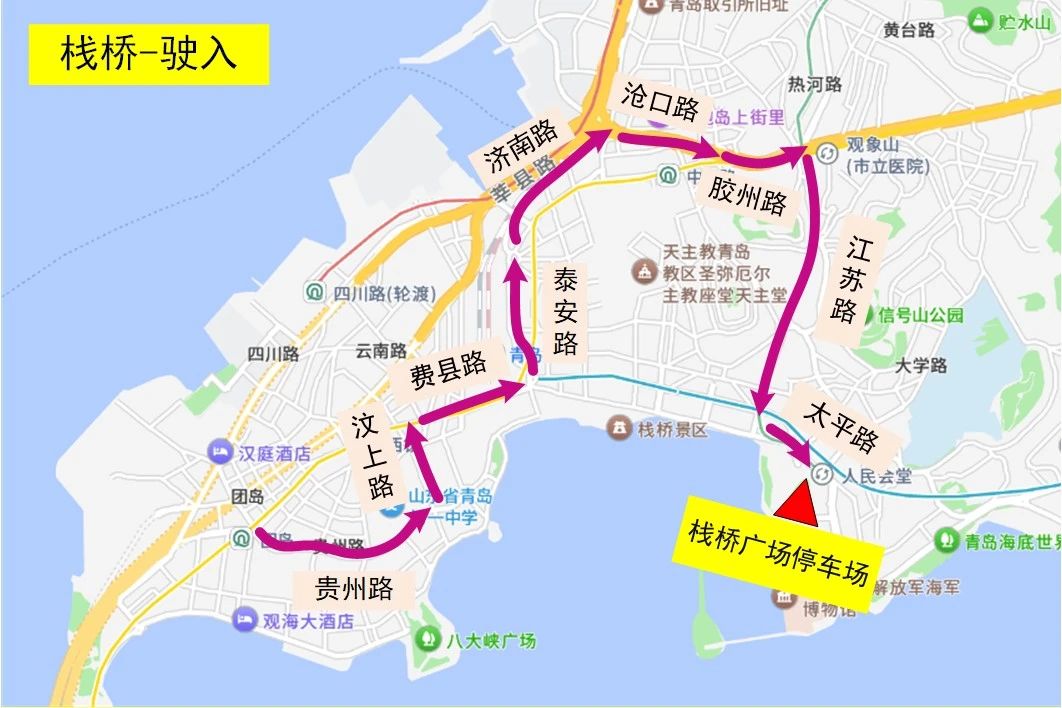 驶入:贵州路→汶上路→费县路→泰安路→济南路→沧口路→胶州路→江苏路→太平路→停车场