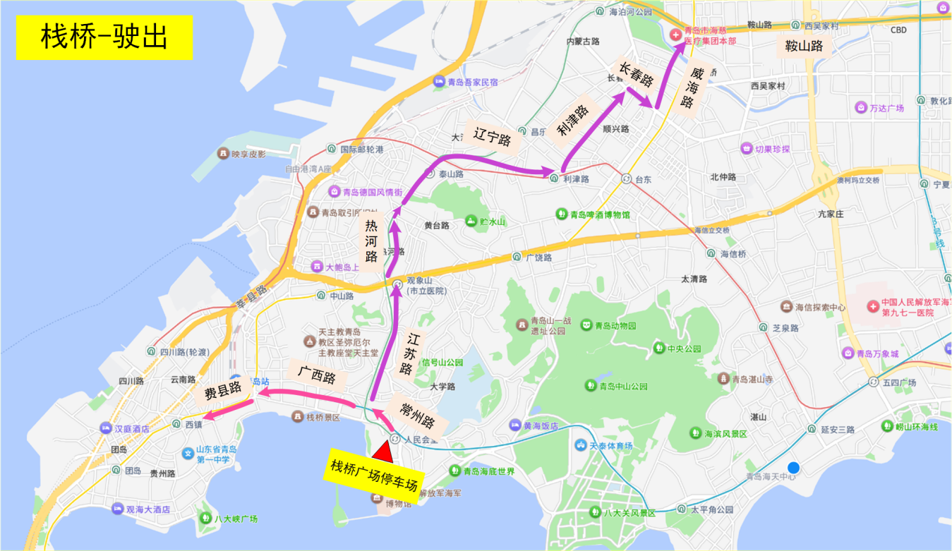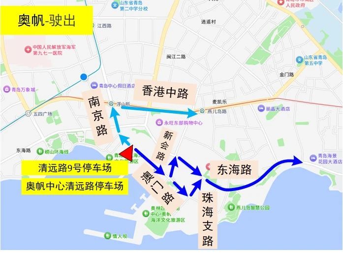 驶出:黄金海岸停车场→香港东路→海尔路/深圳路/松岭路/秦岭路/云岭路