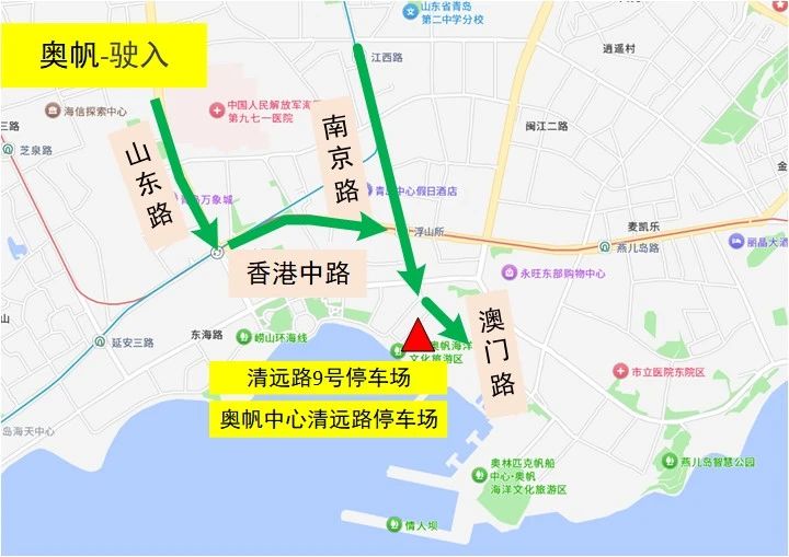 驶入1:香港东路西段→海游路→东海东路→停车场