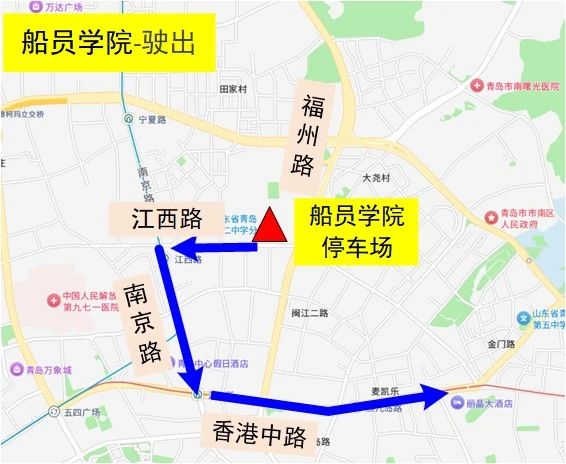 驶出2(备用路线):停车场→武昌路→香港西路(公交车专用道)→香港中路向东行驶